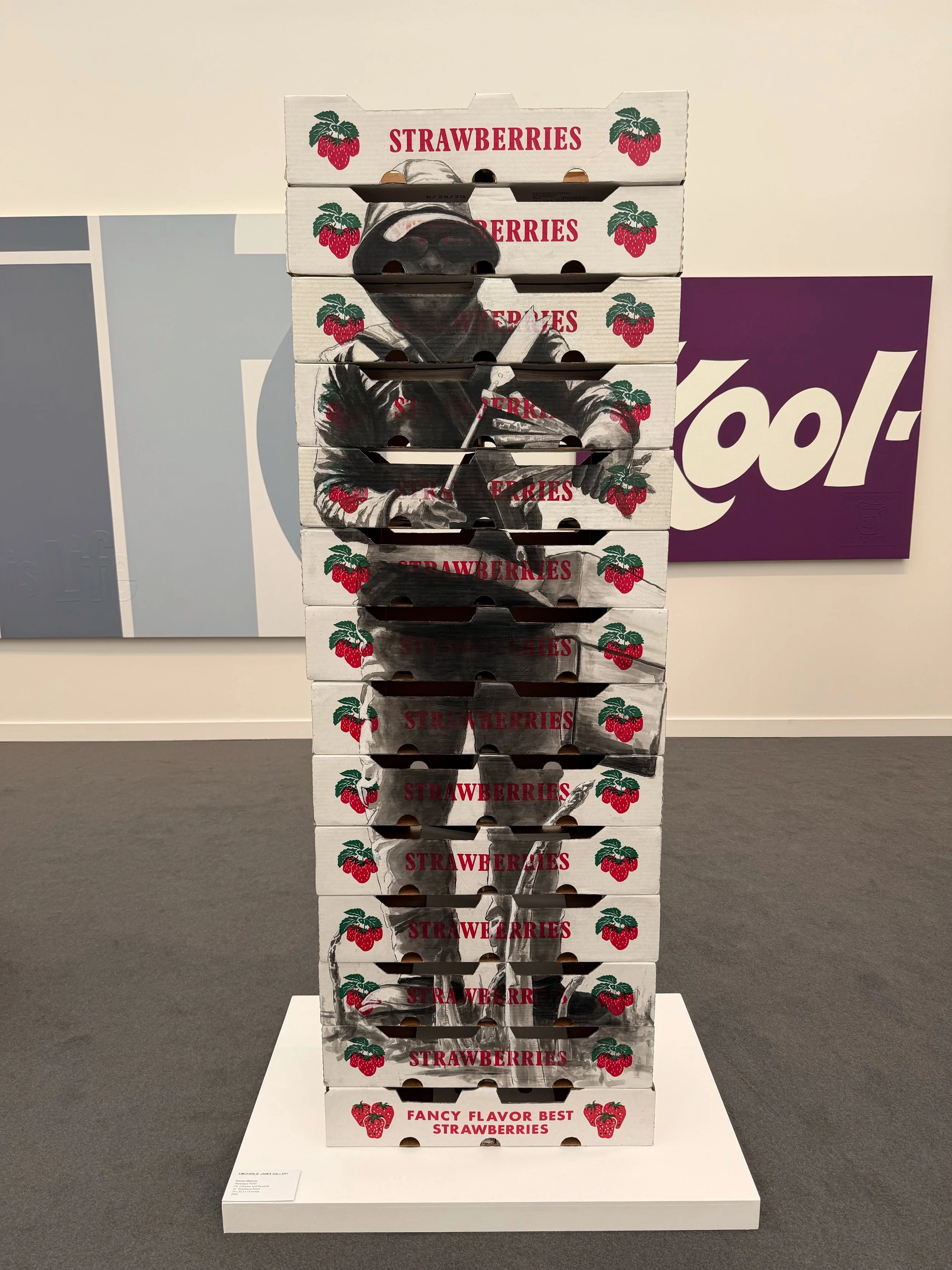 From a portrait of Patti Smith anchoring one corner to an installation of strawberry crates stacked with the image of a single farmworker painted across their surfaces, the exhibition stretched wide. It was expansive in subject and scale, yet deeply personal in tone.