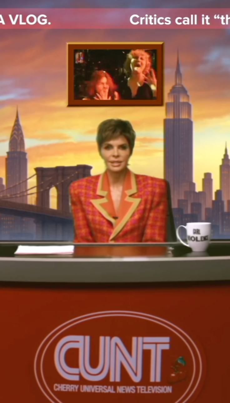 Beyond Lisa Rinna’s incredible performance, the strong set design, and immersive graphics, the world of CUNT News is playfully painted with details like a never-ending breaking news banner: “KING PRINCESS REPORTEDLY STORMS OUT OF THE STUDIO AFTER BEING ASKED TO DO HER JOB,” or “New trend of cheating on spouses at concerts takes the internet by storm. Who will cheat at the King Princess concert next?”