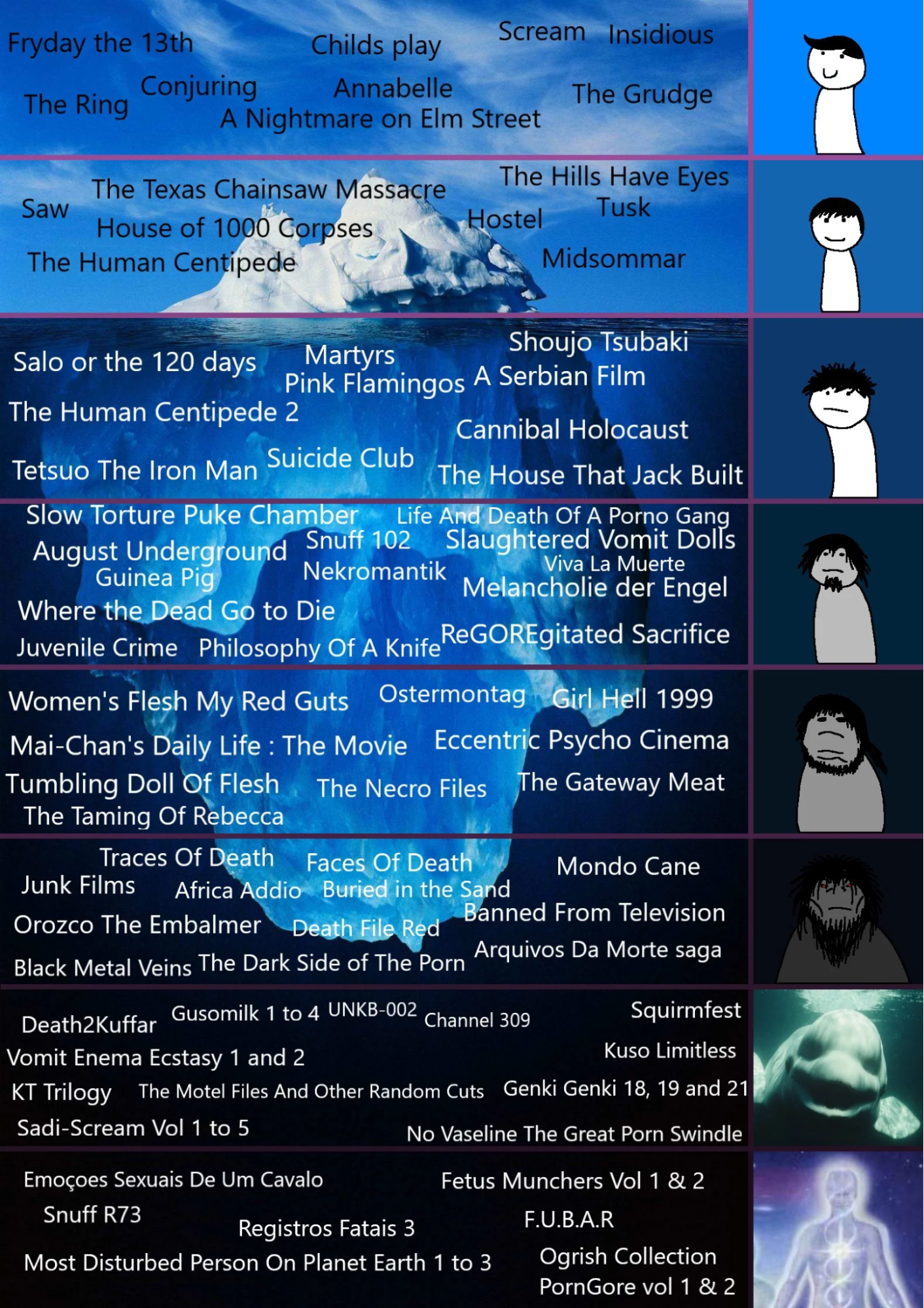 For those unfamiliar with the Disturbing Movie Iceberg, I recommend checking out Green Slop & Political Shit: The Disturbing Film Iceberg, my previous article on the subject. The TLDR is: there’s a tiered list of films that grow increasingly disturbing as you descend. In that earlier piece, I covered the first “beneath the water” tier -- movies that are unsettling and somewhat niche, but not the deepest or most extreme. That tier includes Salò, Martyrs, The House That Jack Built, Pink Flamingos, Cannibal Holocaust, and Tetsuo, all of which I’d already seen. It also includes Suicide Club, Shoko Tsubaki, Human Centipede 2, and A Serbian Film, which I watched for the first time for that article (that’s how much I love Gut Instinct Media).