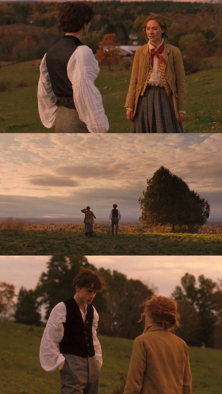 Timothée Chalamet’s Laurie, in his confession to Saoirse Ronan’s Jo, is all trembling boyishness and wounded pride. It is earnest and raw. His voice cracks on the words of love and on the words of rejection. Gerwig lets the silence between them expand until it hurts. It plays like a secret both wish they could forget, which is precisely why it stays lodged in the viewer’s memory. The tension is built on the inevitability of two people who simply cannot want the same life.