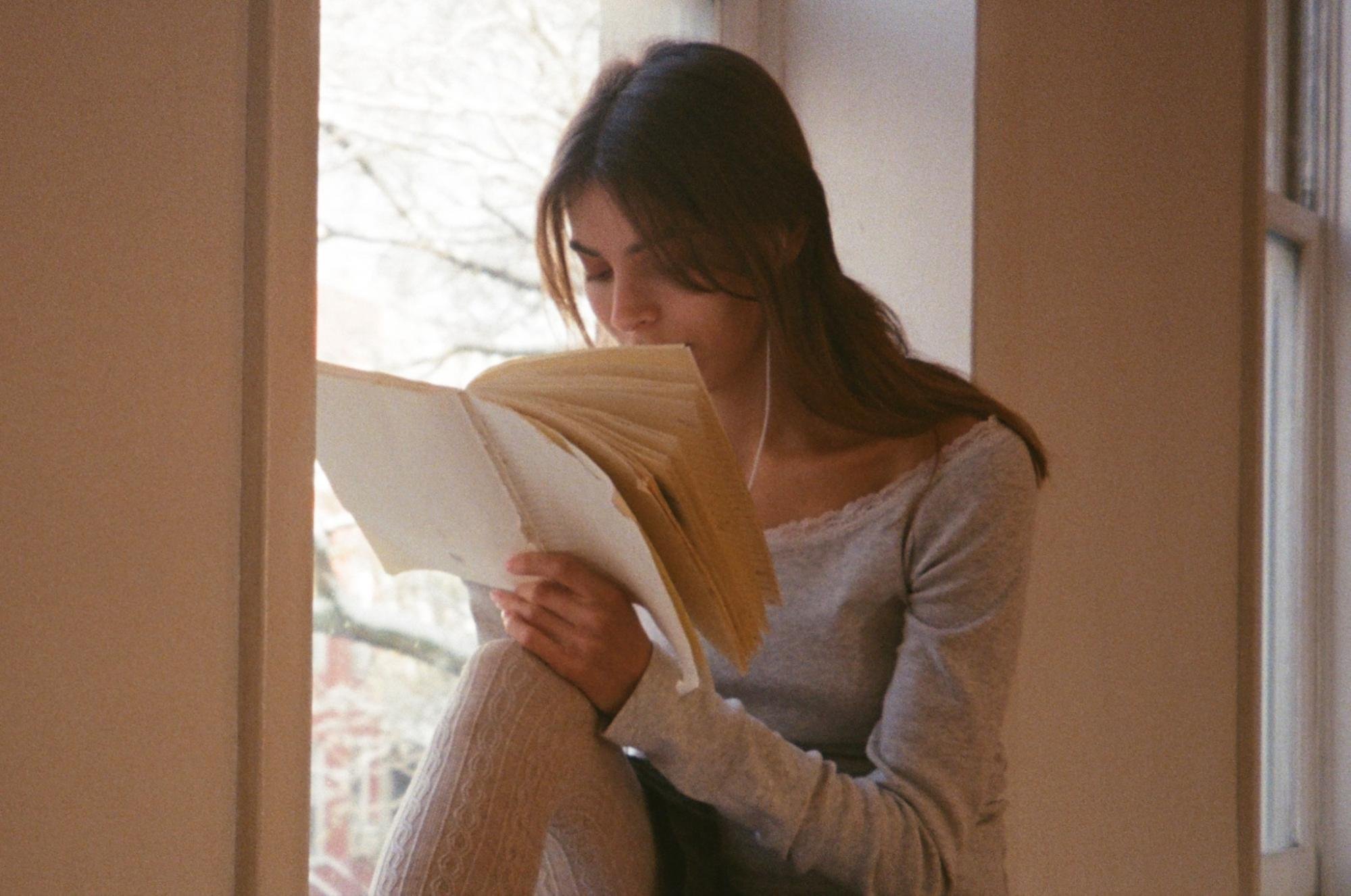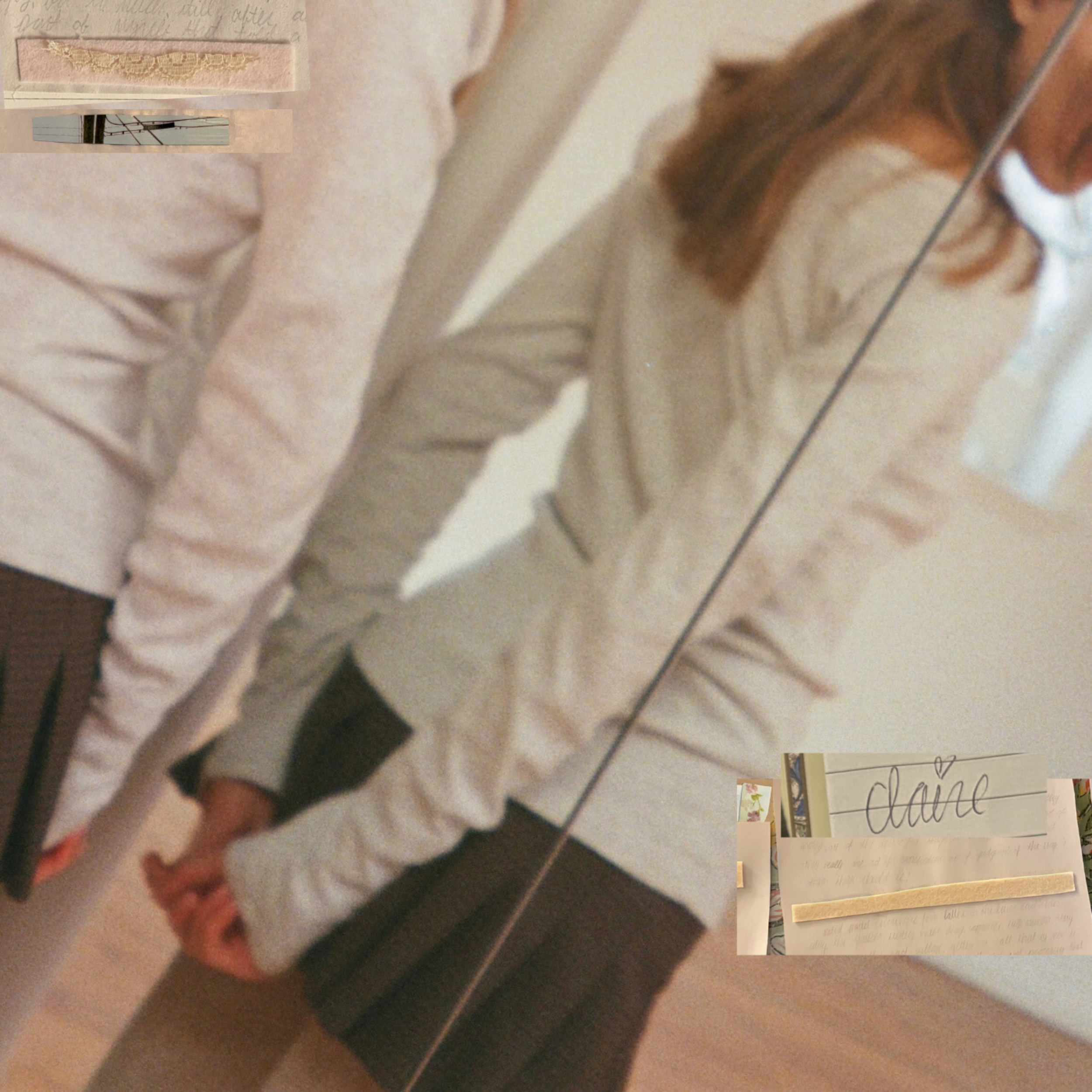 Visually, her world is equally considered. Cursive handwriting. Lace. Ballet-inflected imagery. Vintage materials. Soft pink. She threads them through her photography and film work, and into the cover art for “claire,” photographed by Julissa Yasmeen Ramirez and collaged and designed by Saglibene herself.