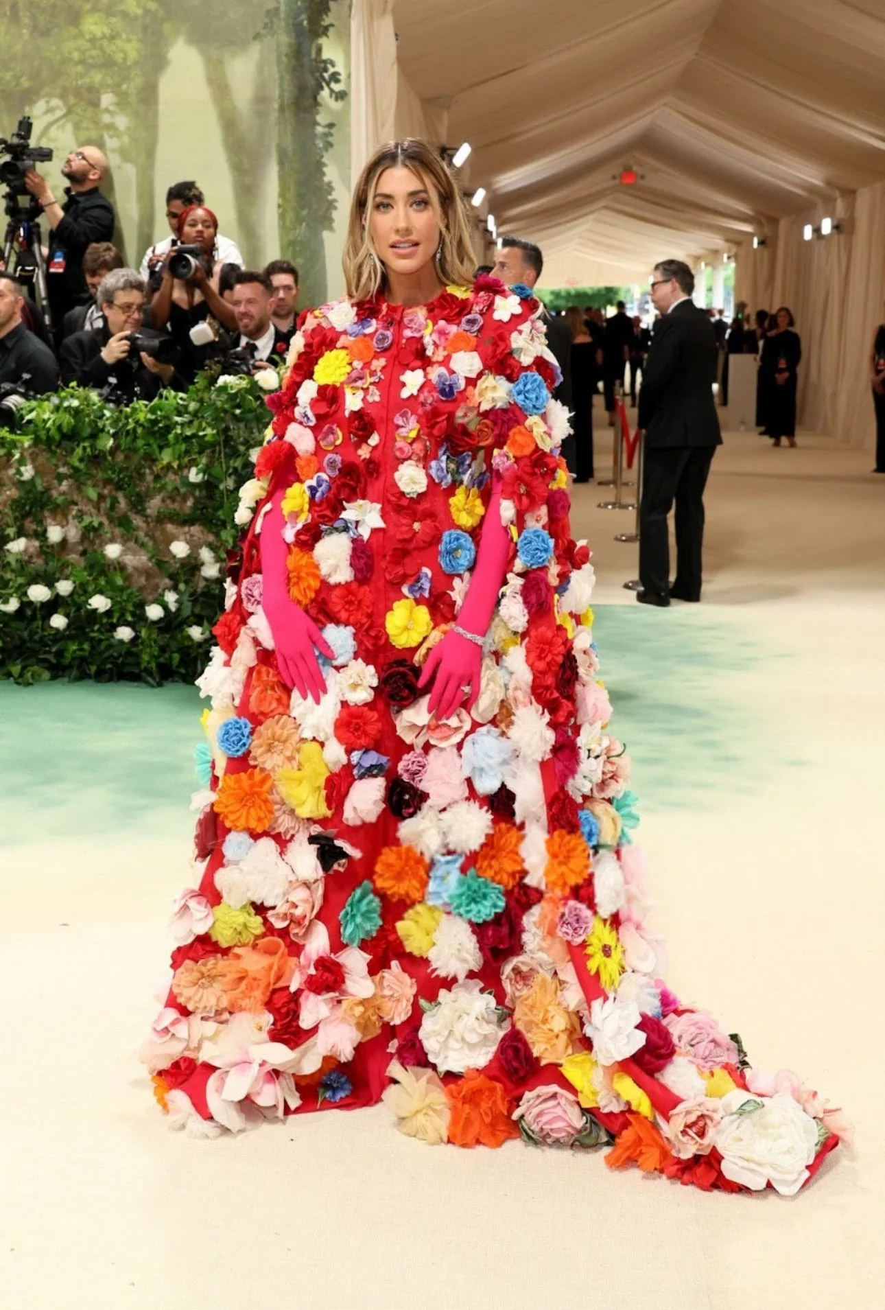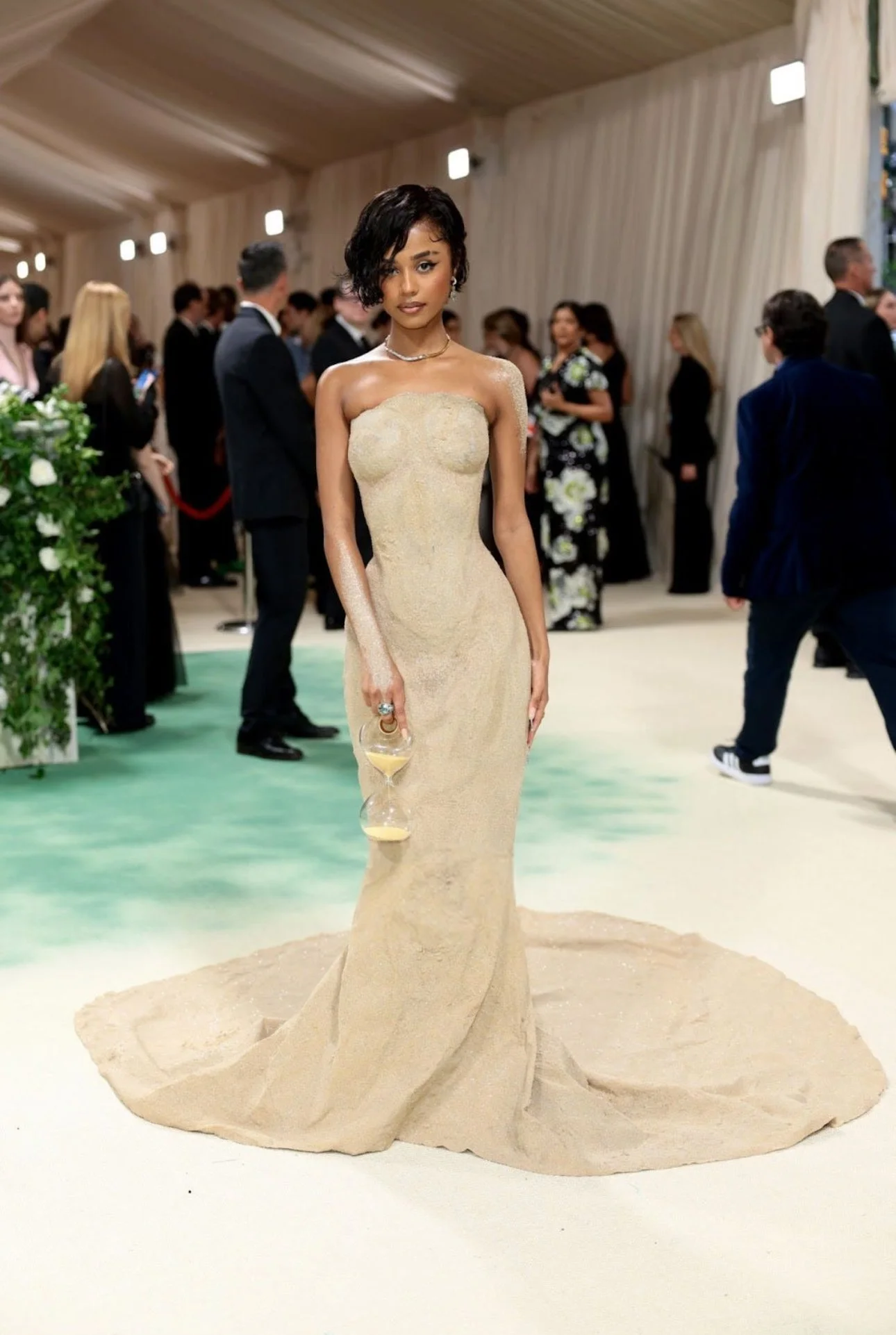Taking the spotlight at spot number three is Tyla. Initially, when Leen and I first saw the pictures, we weren’t completely sold on her look. However, it quickly grew on me, especially past the hourglass bag (symbolizing the sands of time). Tyla made what might be one of the best Met Gala debuts of all time on Monday, stunning in a custom Balmain creation crafted from sand and micro-crystals. The dress was meticulously fitted to the millimeter based on a cast of her body. Completing her ensemble were jewelry pieces by Alexis Bittar and John Hardy, along with an hourglass-shaped purse by Balmain, emphasizing her look’s tie-in to the night’s “Garden of Time” dress code. She even had bits of sand adorning her arms, which is honestly a genius little detail.