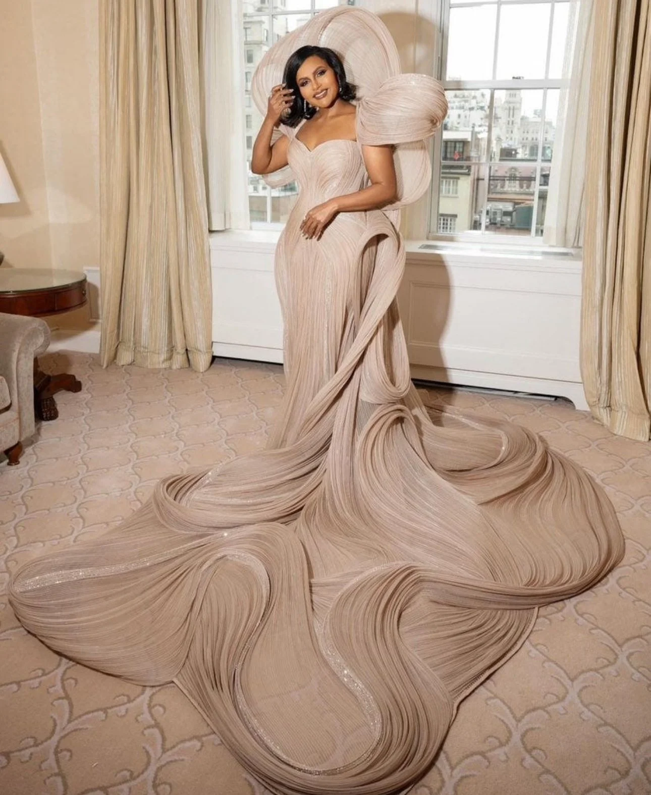 The star commanded attention in a voluminous, nude-colored strapless gown by Gaurav Gupta, calling it “The Melting Flower of Time.” The look featured sculptural pieces that arced over her head and cascaded down her back in a striking pattern of loops and swirls. The gown also boasted a train so enormous that Kaling needed multiple handlers to assist her as she made her way down the red carpet.