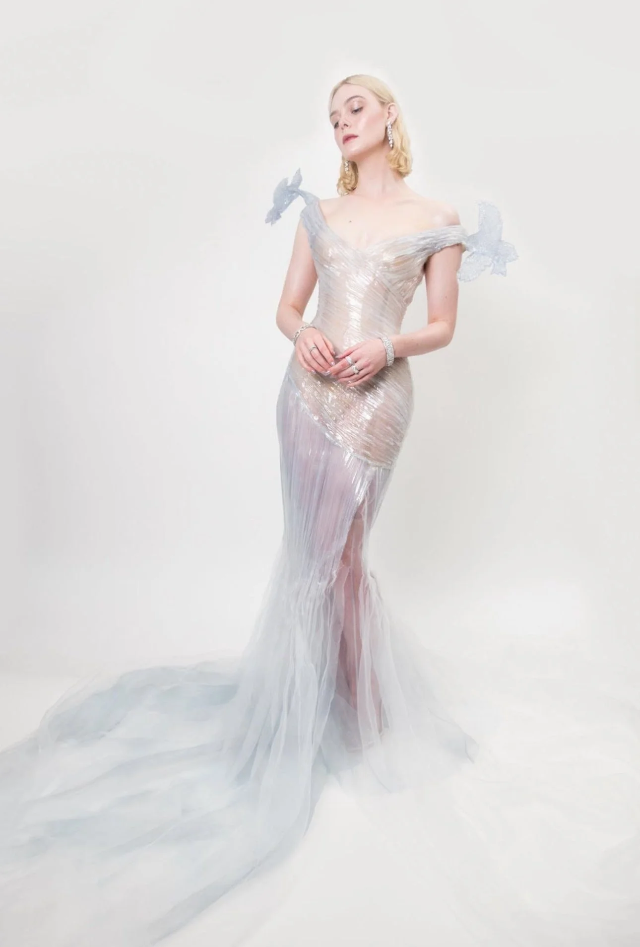 Lastly, Elle Fanning’s gown by Balmain was undeniably gorgeous, although it didn’t quite make it into my top five due to its familiarity. The sculptural off-the-shoulder wrap dress had flowers coming off the neckline, giving her a radiant and ethereal appearance. Fanning paired it with simple silver sandals and cascading diamond earrings by Cartier, completing her elegant ensemble with rosy makeup and wavy blonde hair tucked behind her ears.