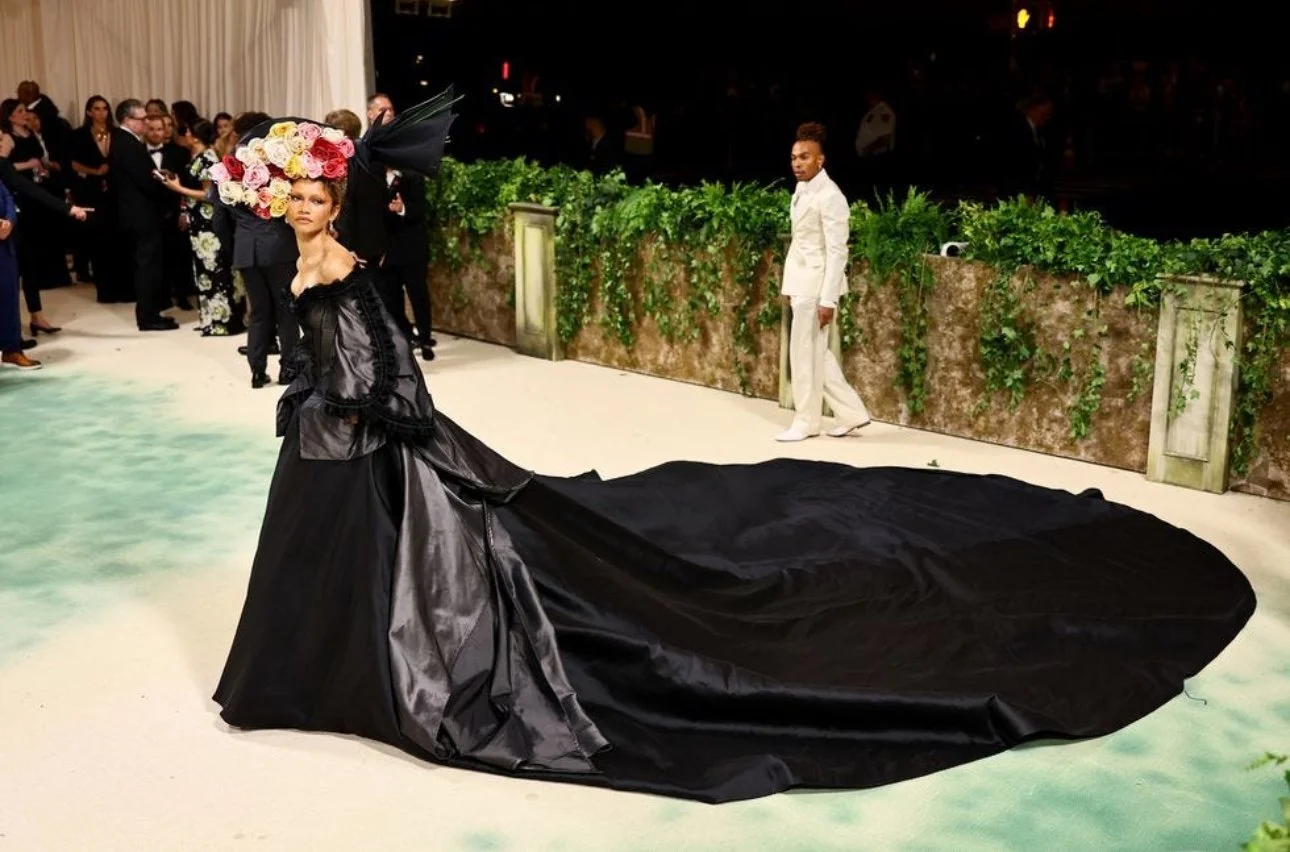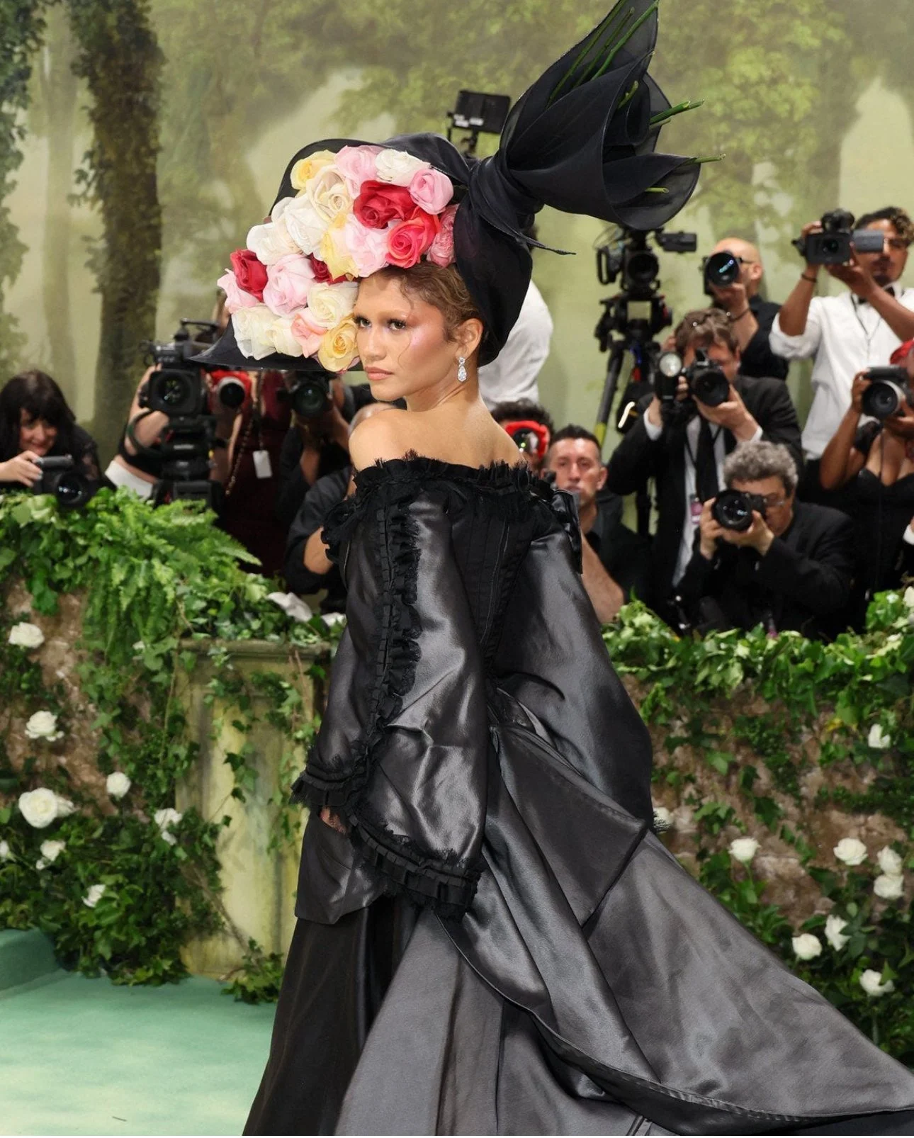 As if one incredible look wasn’t enough, Zendaya reappeared at the bottom of the steps, closing out the carpet, this time wearing a magnificent black gown — a 1996 piece from John Galliano’s Givenchy era. It included a corseted lace-up bodice with long, puffy off-the-shoulder sleeves and a structured peplum hemline fitted with pockets. The gown was complemented by a ginormous skirt that nearly engulfed the length of the Met’s staircase. To top it off, she wore a bouquet-themed fascinator wrapped in black tulle, designed by Philip Treacy for Alexander McQueen back in 2006. Nailing every aspect of the theme, these two looks are bound to be remembered forever.