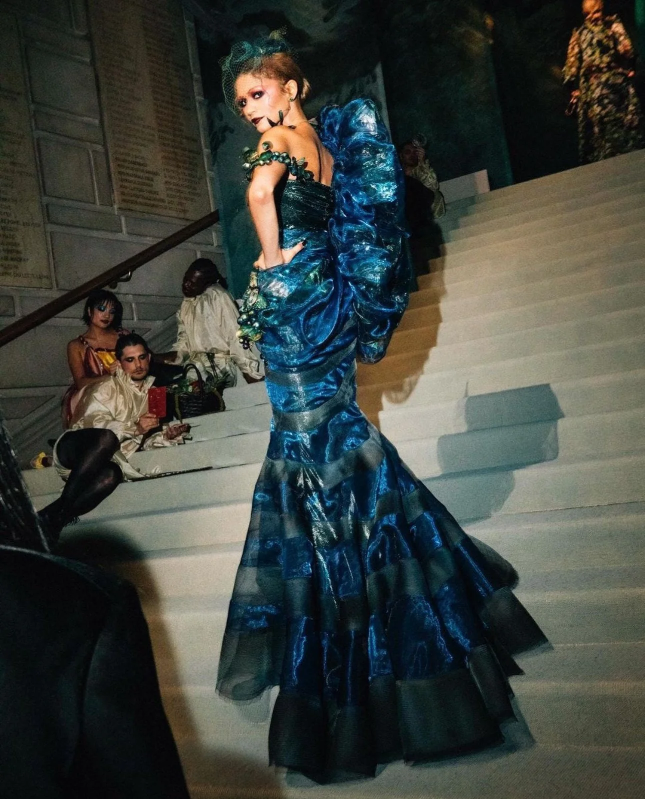 Starting with look one, she embodied a full fairy-tale villain in an incredible Maison Margiela Artisanal by John Galliano creation, based on a 1999 Dior dress. The one-shouldered gown featured a long trumpet skirt covered in royal-blue and emerald-green diagonal stripes, with fruit-like embellishments adorning one side of the waist. She elevated the look with a net mesh and tulle-feathered fascinator. The little hummingbird that adorned her collarbone was the cherry on top for me. Hummingbirds hold personal significance for me, and besides, I practically consider Zendaya a friend — I met her as a child. All jokes aside, the little hummingbird detail sold me right away.